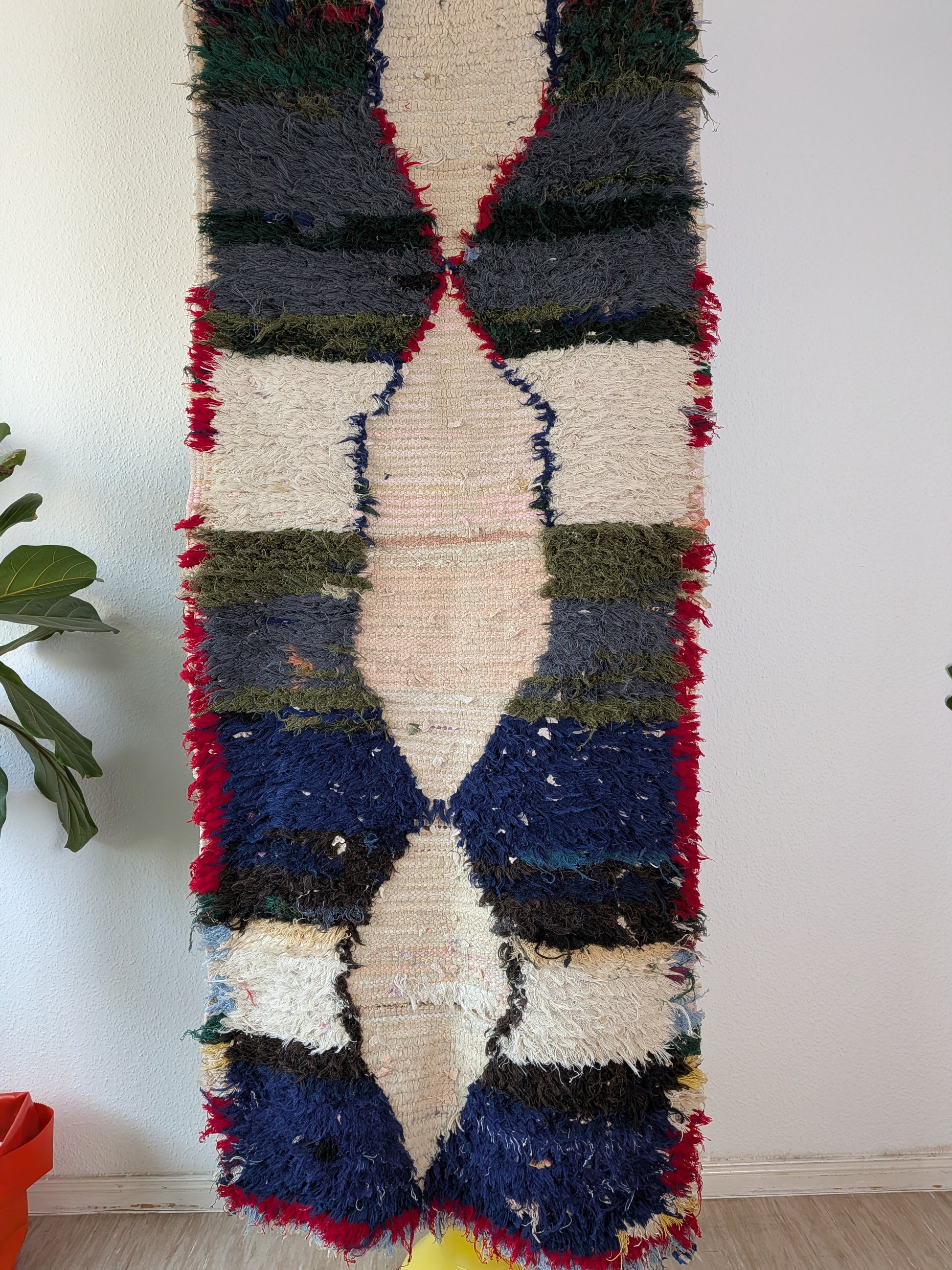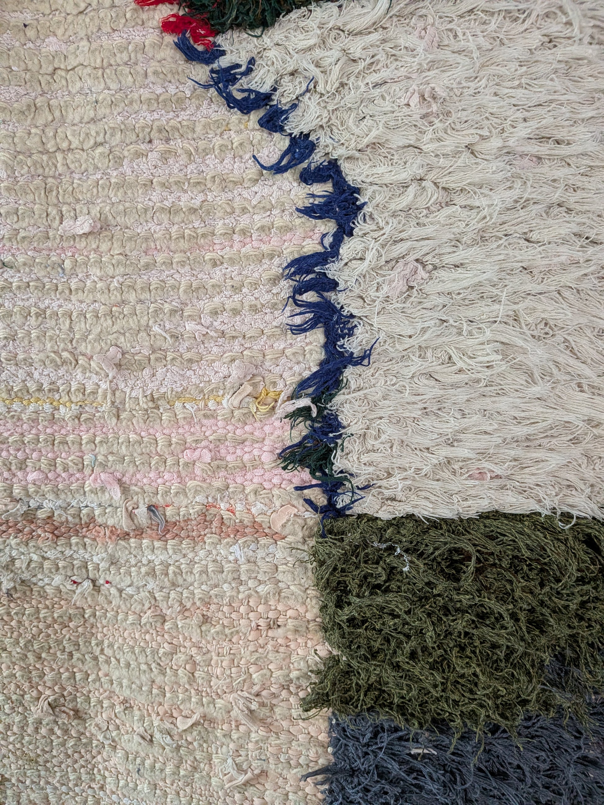 Boucherouite rug (or boucharouette) represent the expression of the Moroccan rural art. They are entirely made from recycled fabrics or, sometimes, wool. The base material is carefully selected by women. Subsequently, these elements are woven and sewn together by hand with no set pattern. The result is a beautiful patchwork of patterns and colors. Each piece produced is unique and special.