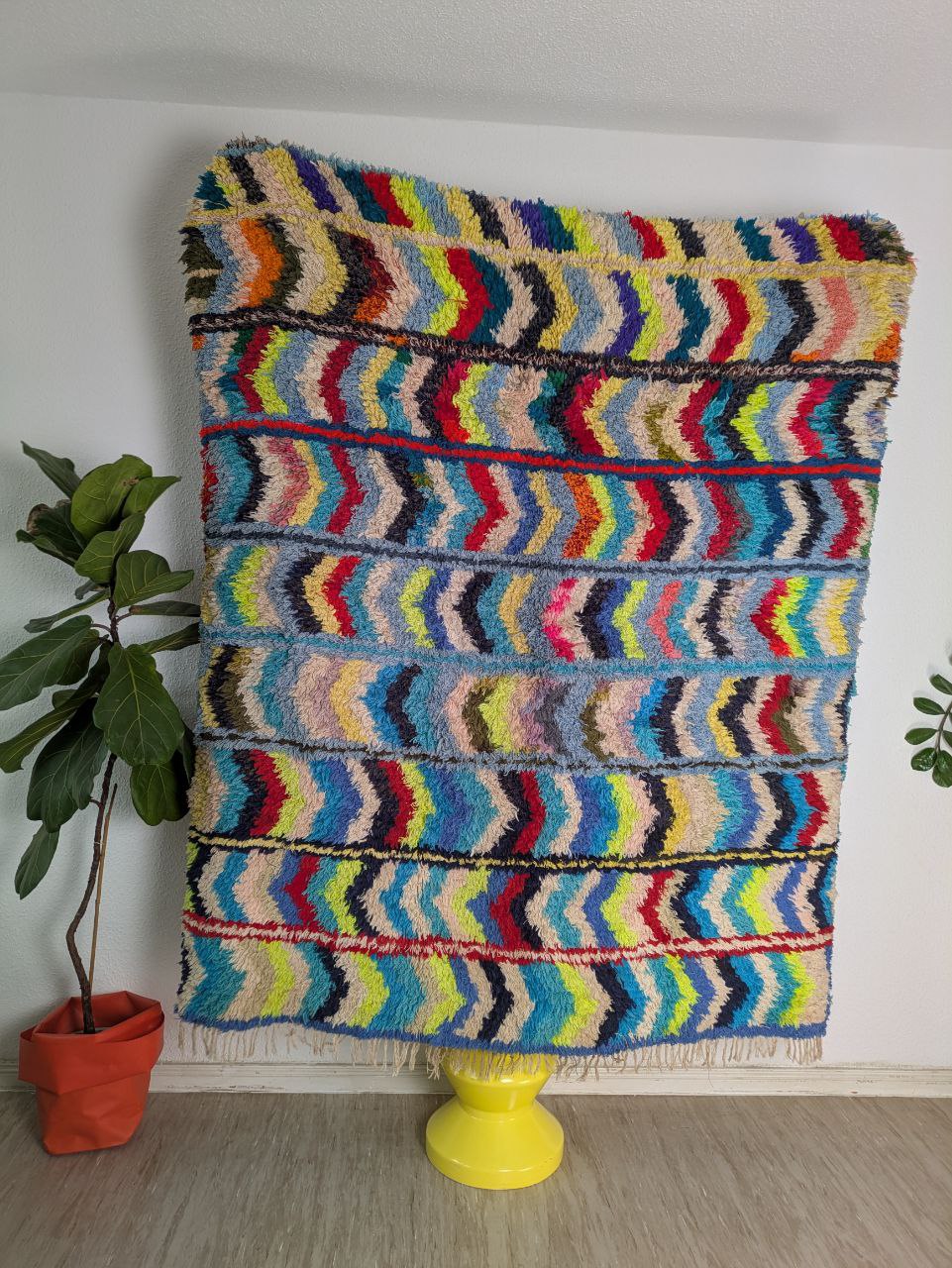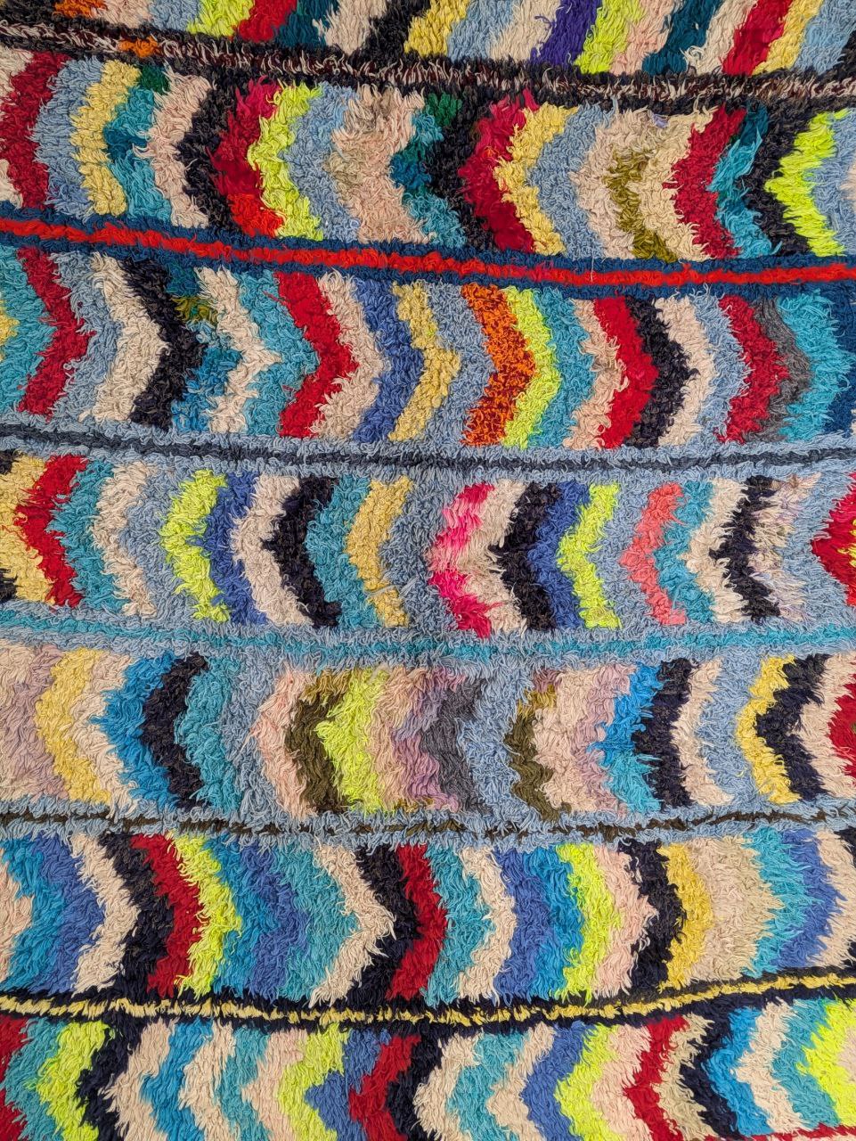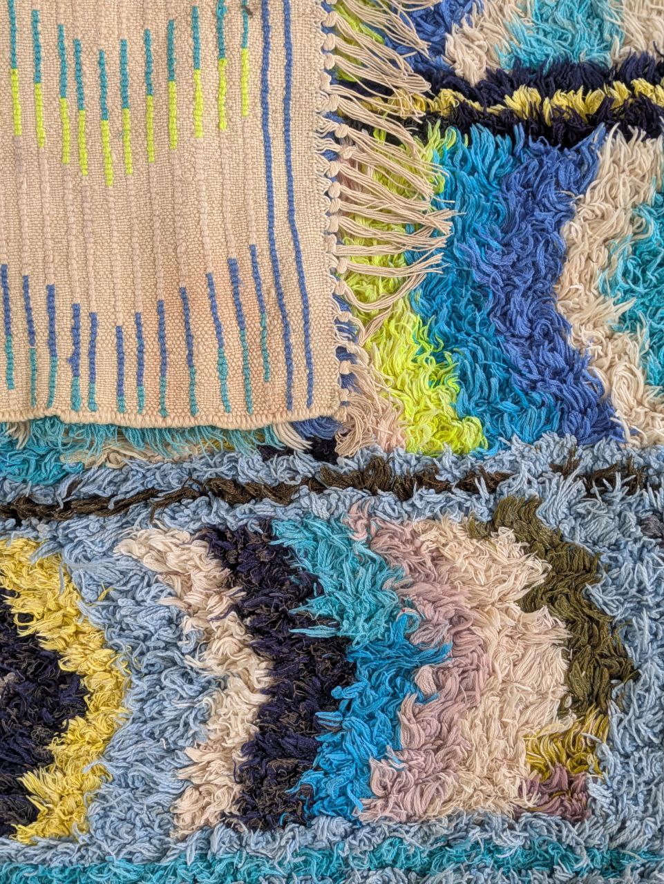 Boucherouite rug (or boucharouette) represent the expression of the Moroccan rural art. They are entirely made from recycled fabrics or, sometimes, wool. The base material is carefully selected by women. Subsequently, these elements are woven and sewn together by hand with no set pattern. The result is a beautiful patchwork of patterns and colors. Each piece produced is unique and special.